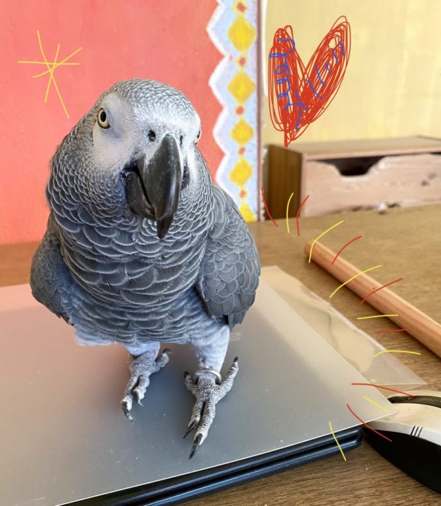 声をする方を見ると、オウムがパソコンのキーボードの上をのんびり散歩中。
