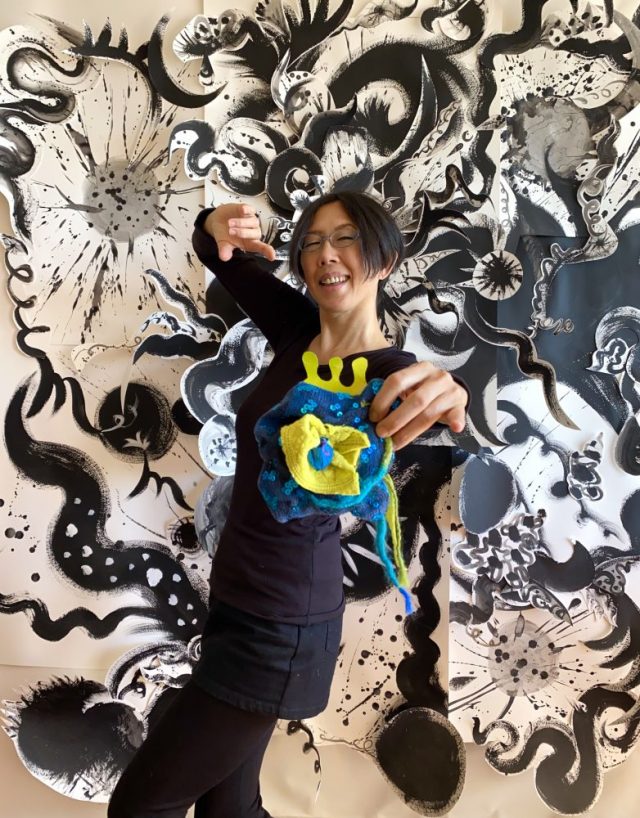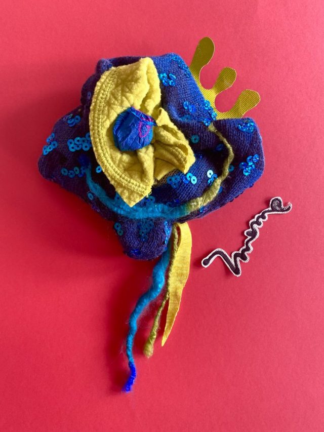 「空」「海」「太陽の光(ぴかり)」を寄せ集めて、ブローチアート。服のキレハシを使って。切って、縫って、くっつけて。毎日、異なる素材と遊んでいる。