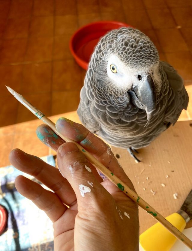 オウムがいきなり「水差し」に頭を突っ込んだ。そう、あの絵の具のついた筆を洗う、汚れた水の中に。
