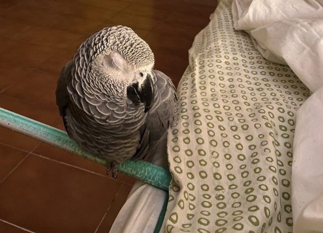 笑。振り落とされ、床できょとんとするオウム。「うわ〜っ、ごめん」。あわてて枝を再構築。お尻の下にホウキを入れ、体重で固定。ぷりぷり床で怒っているけれど