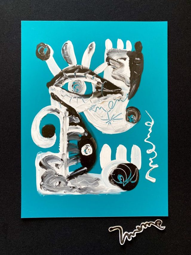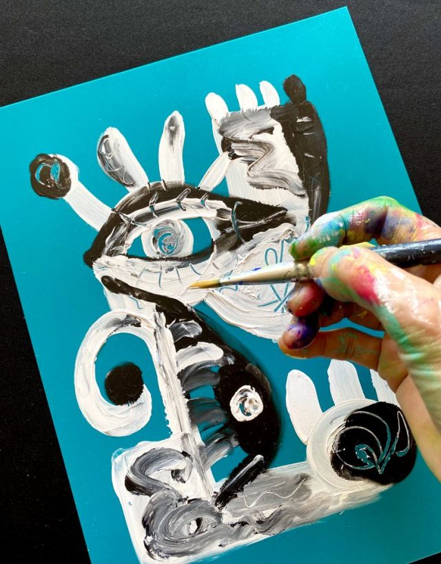 白と黒で。筆と指を使ってペイント。実はこれ、クリアーファイルの表紙。プラスチック部分をカットしてキャンバスに。何でも素材(笑)。