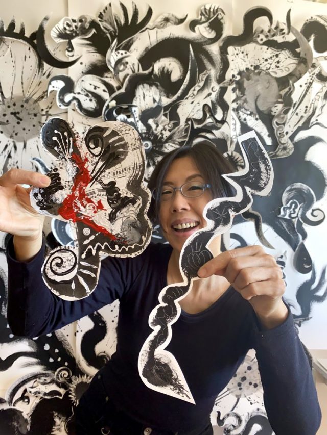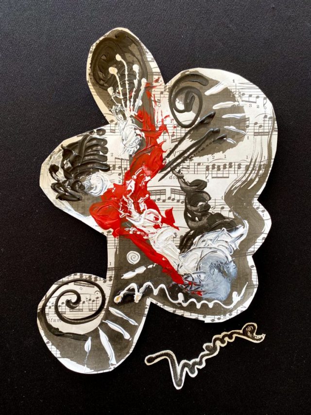 心の音が燃え上がる。けして尽きることのない心の種火。愛。アトリエに山積みの楽譜にペイント。次回は楽譜だけを使って立体アートしてみたい。
