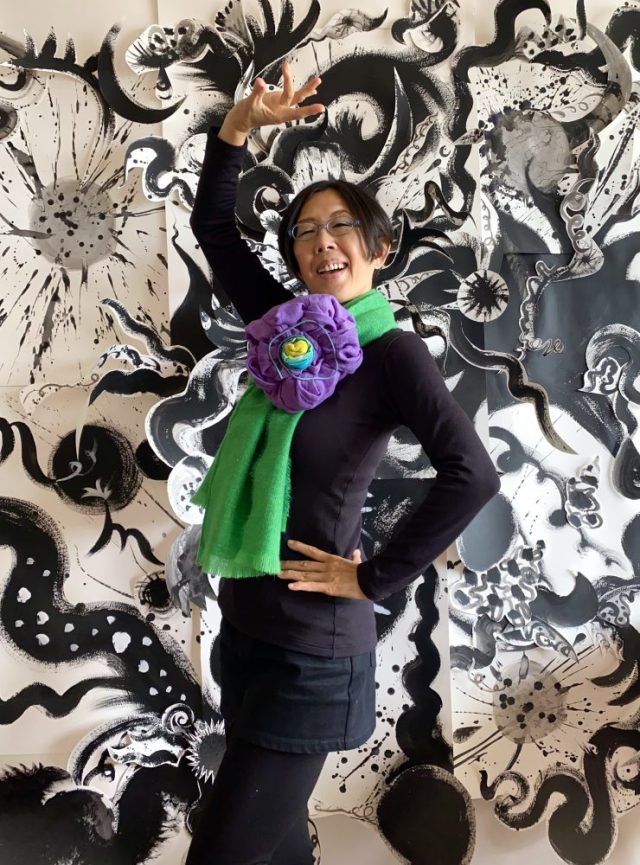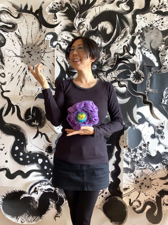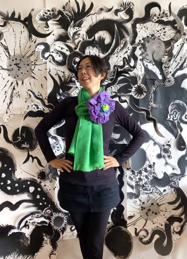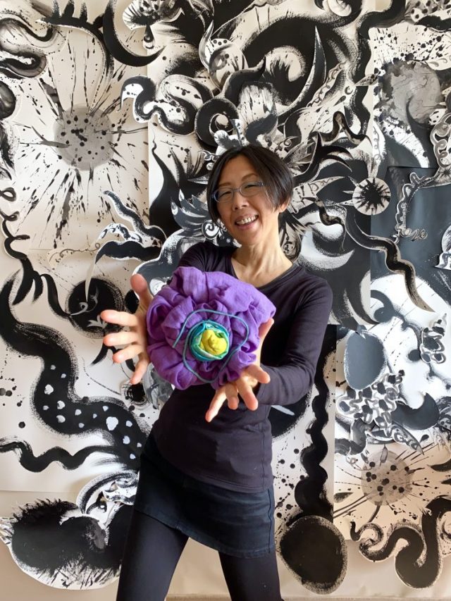 が待っている(←うちの場合、必ずここを通る)。ぐるぐると巻いて、しばって、縫って。不思議な大輪の花ができあがった。