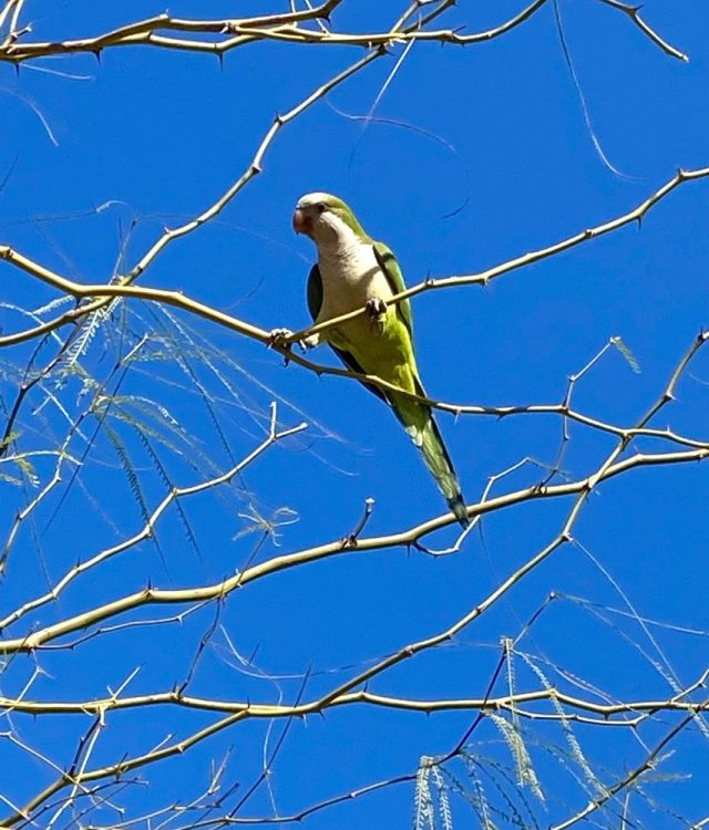 緑のかわいらしい野生のインコ(写真)。がんばれ〜。そこで、ふと思う。