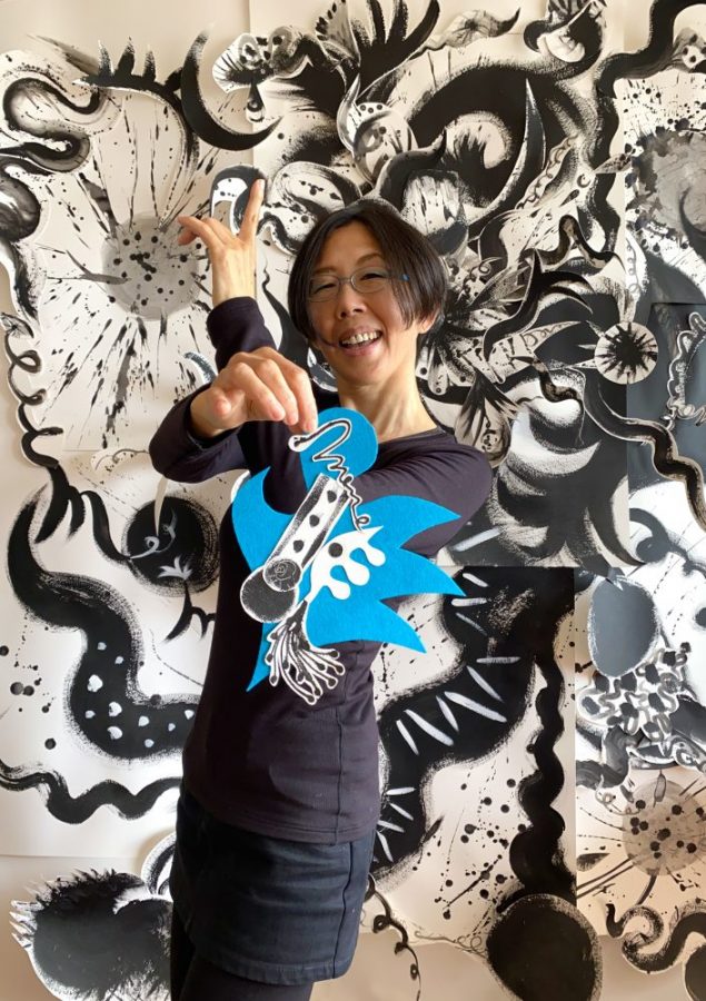 を聞きながら制作(笑)。気になる情報が流れると、筆やハサミを持ったまま動画を立ち見。すぐにメモを取る。もちろんランチを食べる時も