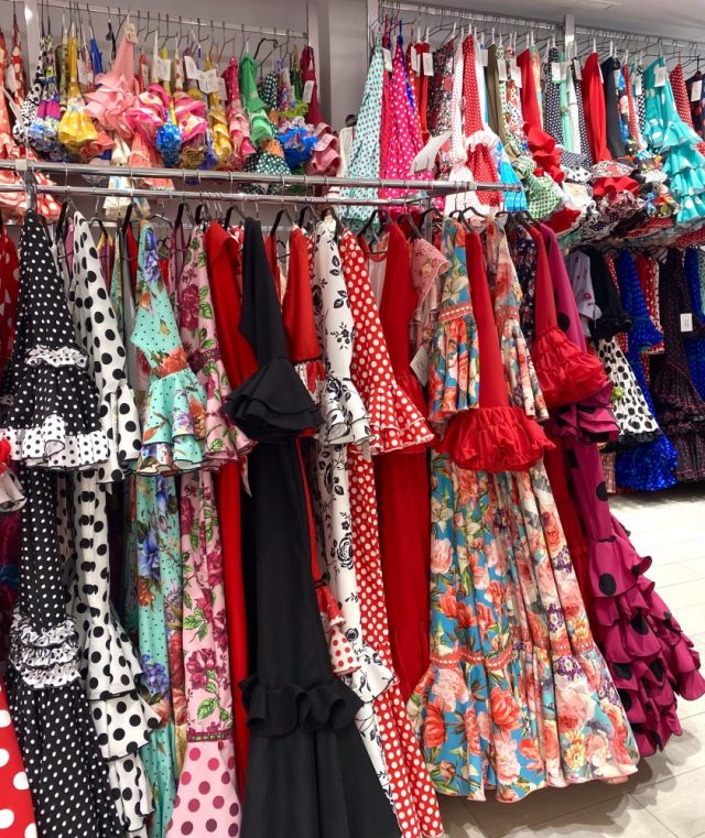 ひらひら、ふりふり。色とりどり。店全体がお花畑のよう(写真)。フラメンコ衣装は基本的に高価なので、新品を買ったことはない(重くてかさばるのも問題)。実は先日、お古のフラメンコドレスをいただき