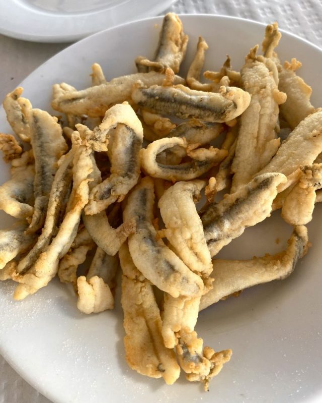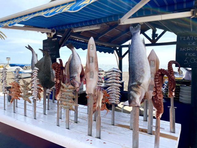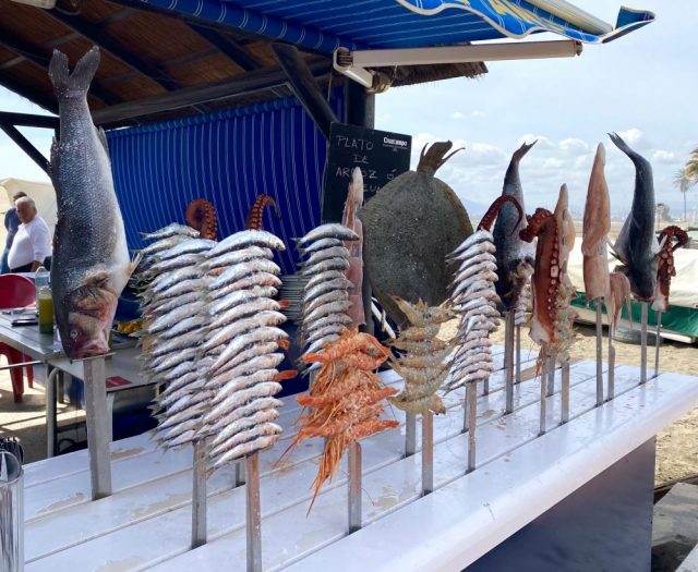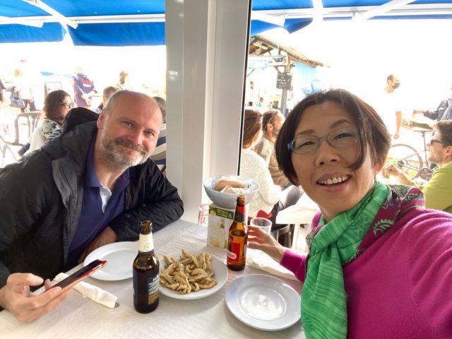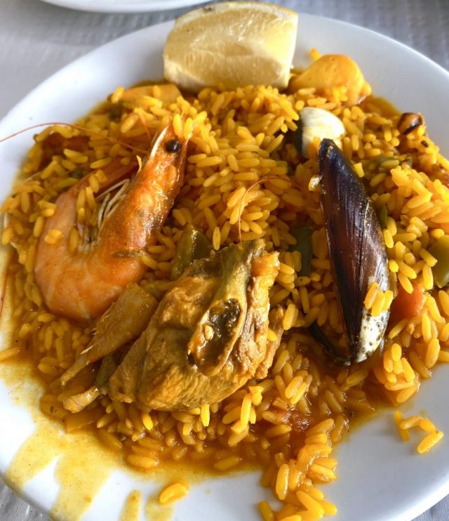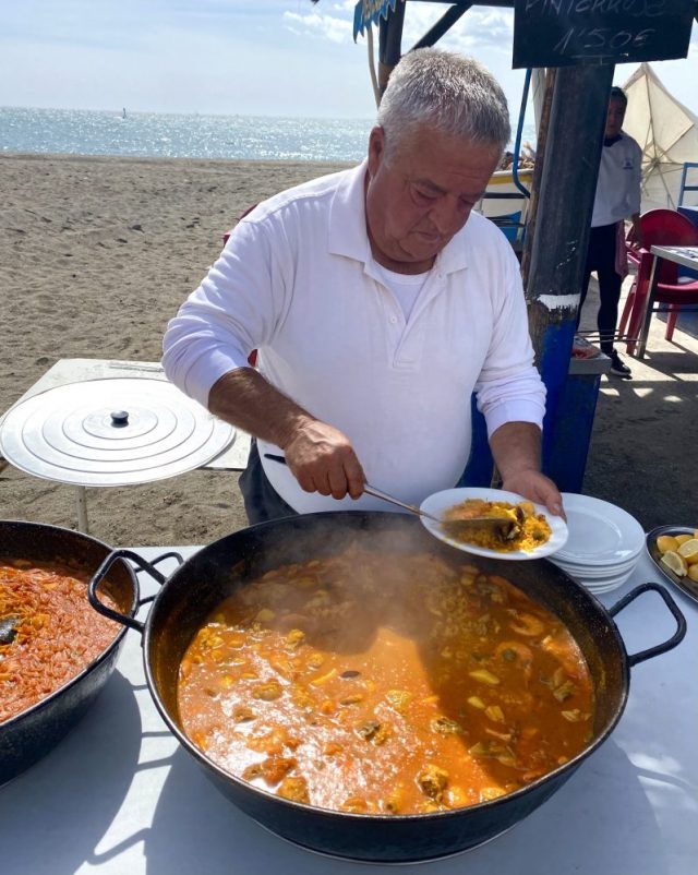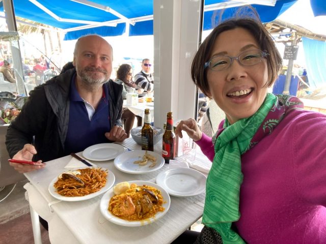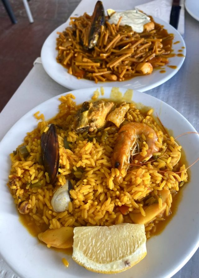 朗報。まずはビールで乾杯。大鍋から、できたての熱々パエジャとフィデウワが運ばれてくる。