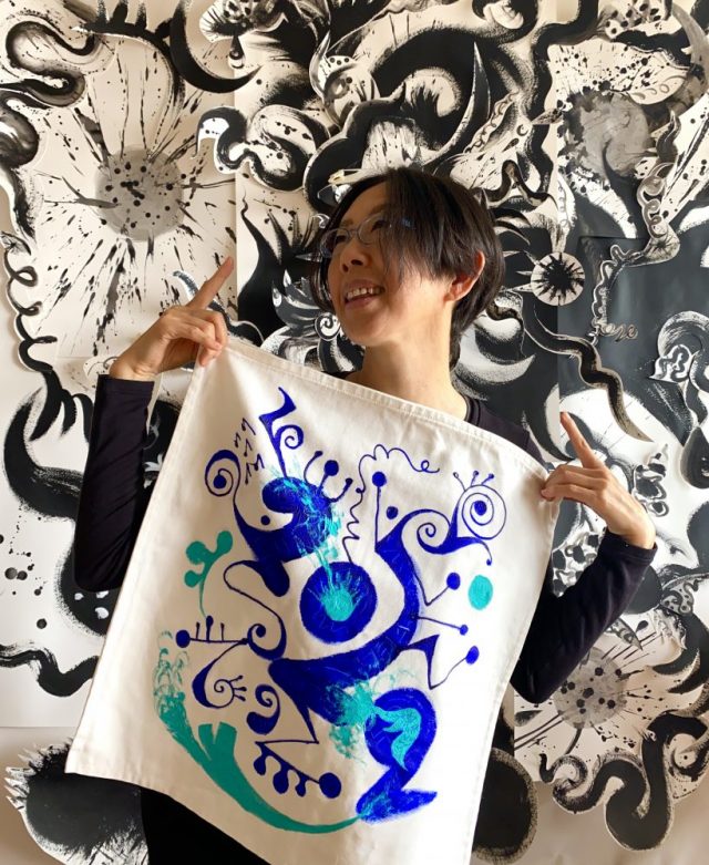 朗報。本日はクッションカバーにペイント。「2022」「FELIZ(幸せ)」「AMOR(愛)」「SUEÑO(夢)」「PAZ(平和)」「ESPERANZA(希望)」 「RESPECTO(尊厳)」の文字が自由に舞い飛び、たわむれる。