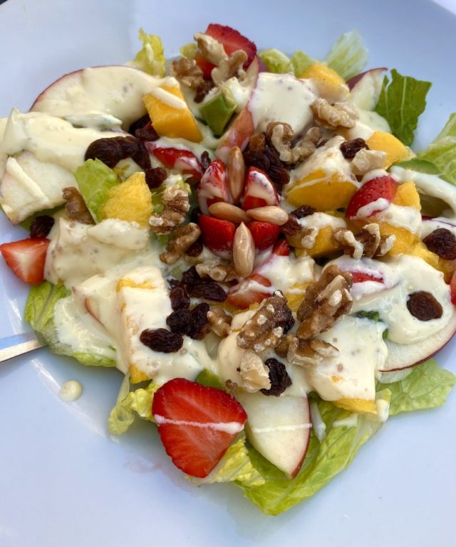 すでに盛り付けがちがう(笑)。まるでお花畑。マンゴー、アボカド、いちご、りんご、クルミ、アーモンドの中に、レタスがある。おまけみたいに。鼻水をすすりながらひと口。