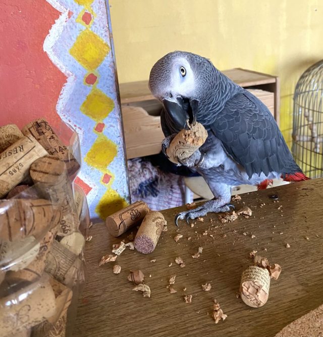 オウムがいた(写真)。ワインのコルク、ぼろぼろやん。さっそく大好物の茹で野菜を用意。いつも一緒に食べているので、オウムの分だけお皿に乗せても
