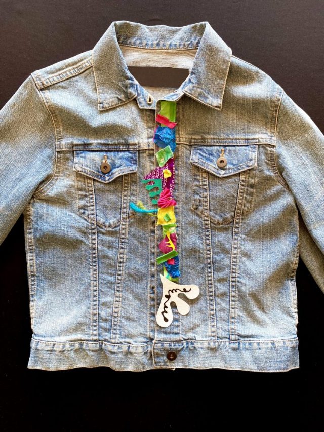 ジージャンアート。なんだか「顔」に見えてきた〜(ボタンが目、青ひもが口)。春に彩られ、むふふと笑う。ねっ?これ顔だよね〜。