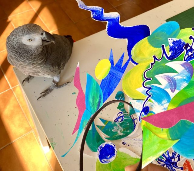 のよう。もしかして、とんでもないことを始めてしまったんじゃ。と、一瞬ぞっとしたものの、前進あるのみ。そのカオスの中、ヘッドアートを制作。オウムも興味津々。