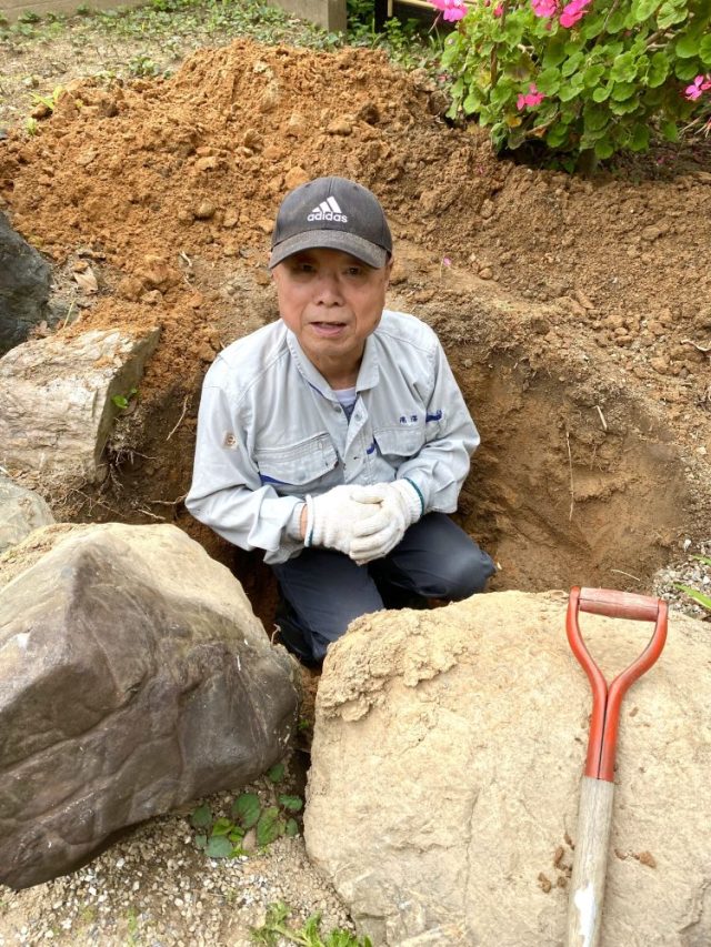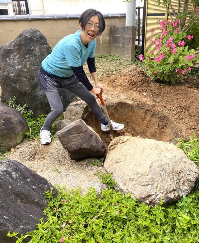その横で、私はひたすら穴掘り(笑)。これ全て、庭の石を埋めるため。やってわかったけど、シャベルで穴を掘るのはまあまあ簡単。問題は、砂の乗った