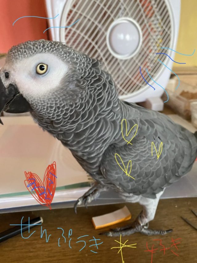 いきなりやってくるオウム。それもなぜか、必ず「扇風機と私」の間に入り込む(写真)。オウム的ベストポジション?