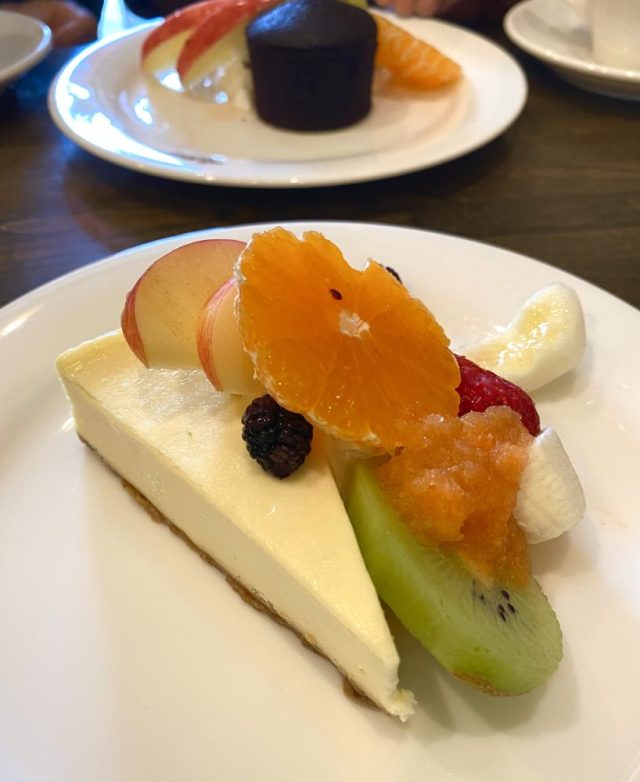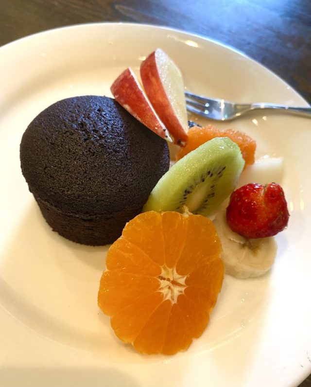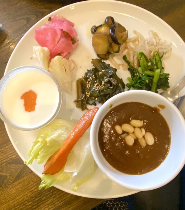 自然を愛し、食べ物や暮らしもできるだけ自然に近いものを実践するお二人が選んだ「玄米カレー&野菜ランチ」。これがめちゃうまー。免疫力アップ。ケーキセットも絶品。しばし近況報告に花が咲く。