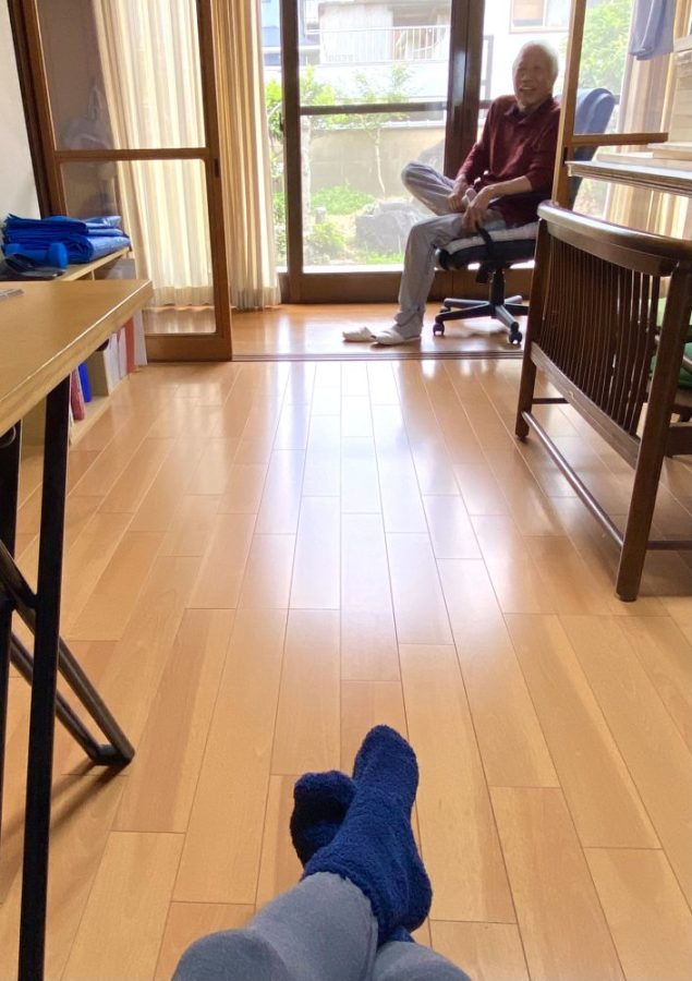 2人で分け合うとおいしいなぁ。腹ごなしに、父が週1で通っている体操教室で人気の「カエルの歌ステップ」を教えてもらう。