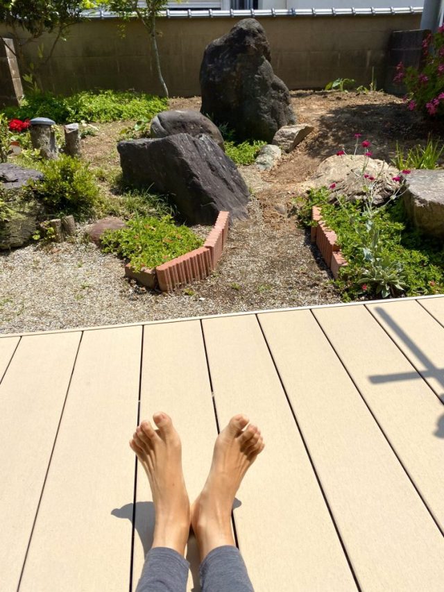 いきなり役立つウッドデッキ(笑)。作業にぴったり。私が置いたガーデンテーブルも「すみません、ここも使っていいですか?」もちろん。作業台として買ったんだから。