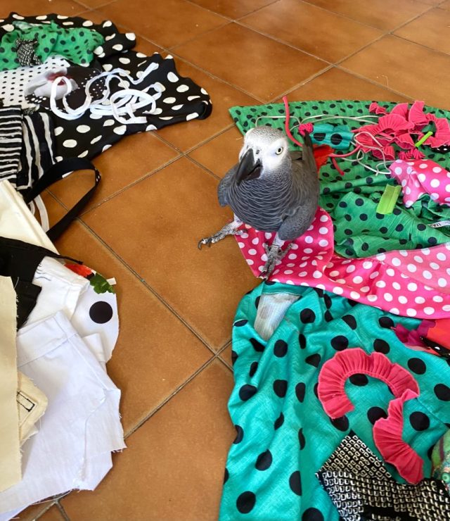 さっそくオウムもやって来る。全てのアクティビティに参加(←呼んでない)。歩き回るのはいいけど、羽ばたくのはやめてね。布やヒモ、飛んでいっちゃうから。