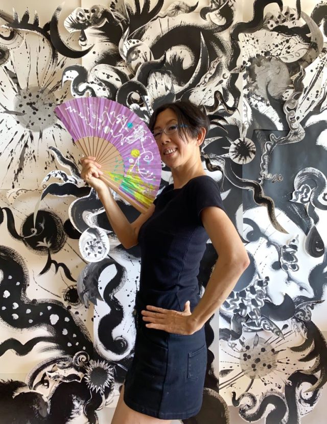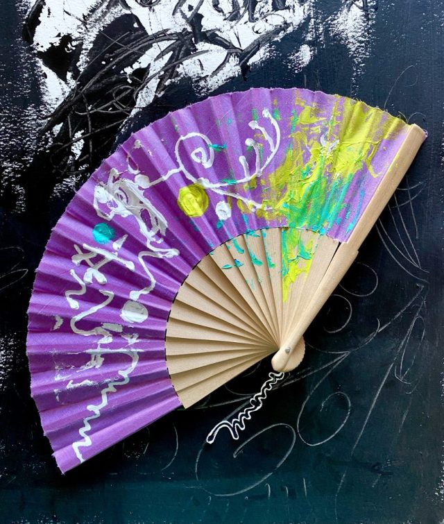 見つめていると、ほーら「選択」の文字が見えてくる〜(笑)。「カリグラフィのダンス」シリーズ。友達からいただいた紫色の扇子にペイント。