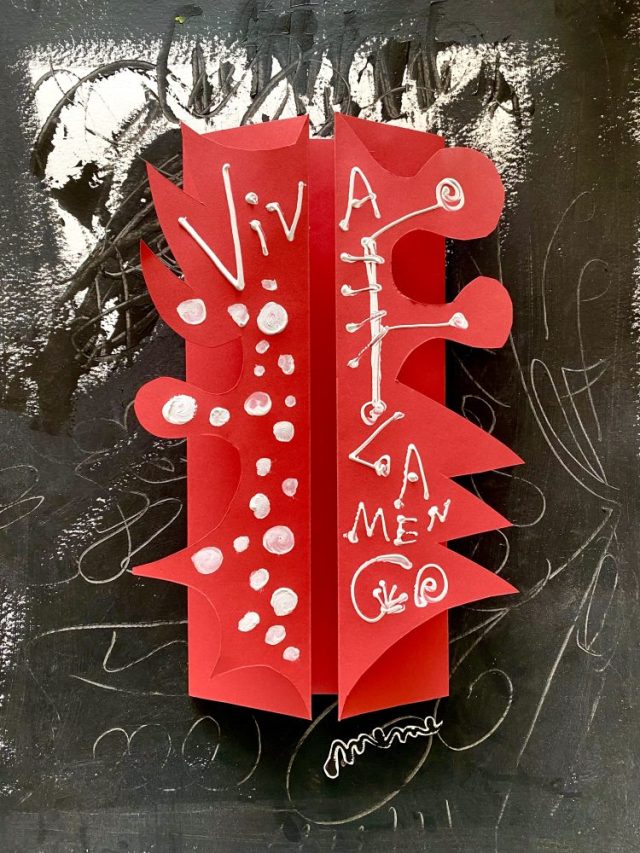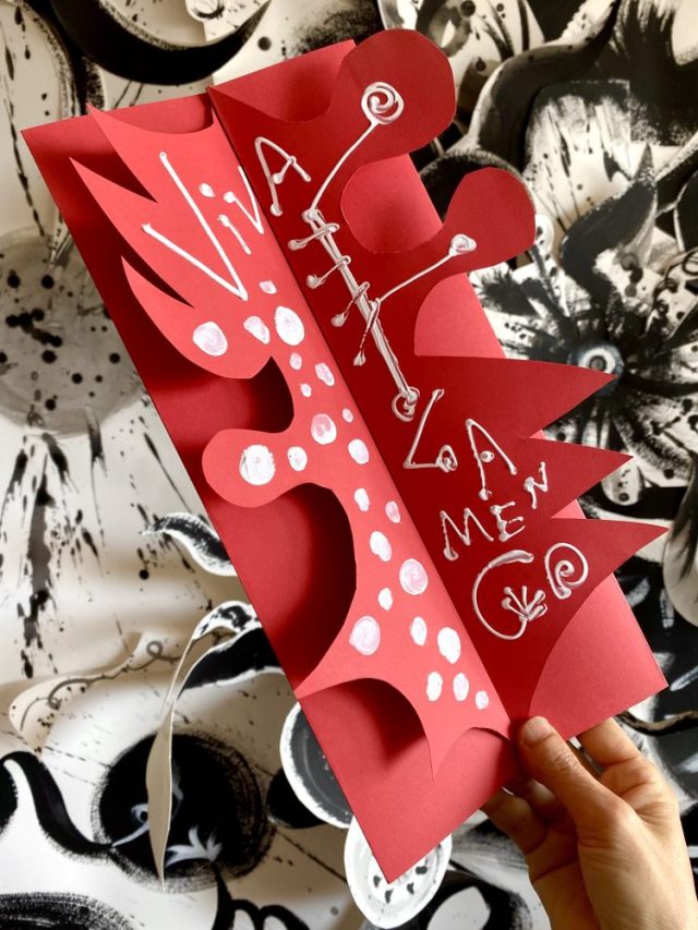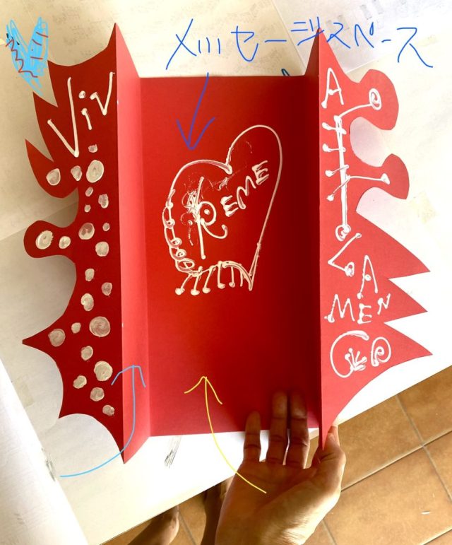 と、言い出したのが始まり。フラメンコらしく赤の厚紙で。折って、カットして、ペイントして。「ビバ、フラメンコ」を描かれたパーツを左右に開くと