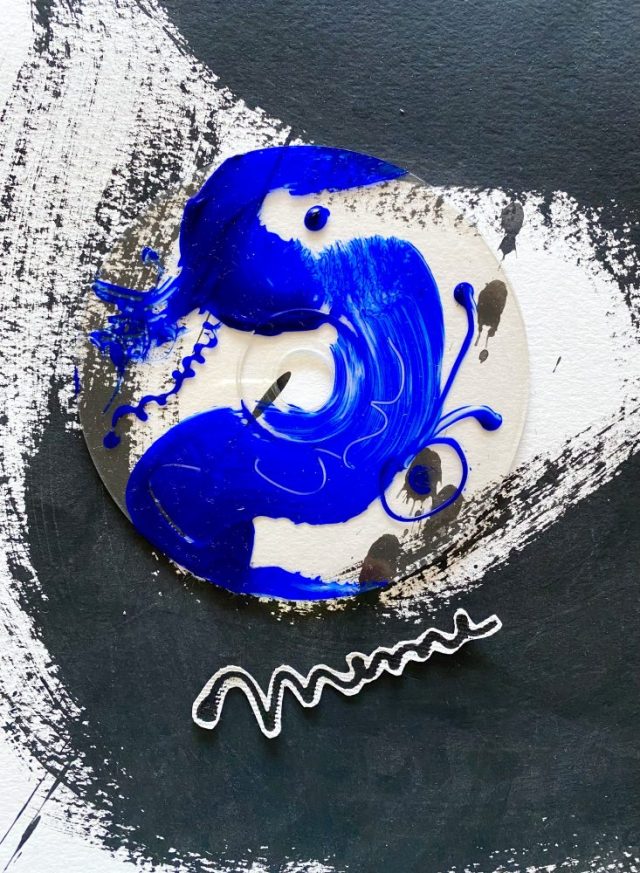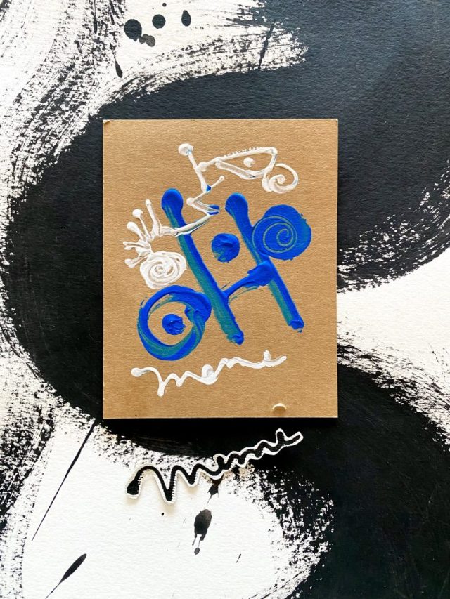 「カリグラフィのダンス」シリーズ。青字は日本語の「音」。白字はスペイン語の「SONIDO(ソニード・音」。音同士が仲よく遊んでる〜。