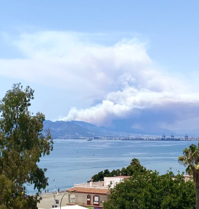煙がもうもう(写真)。消防士や給水ヘリコプターの方々が、休む間もなく消火にあたる。なんせ今マラガは乾季。雨の日はない。からからに乾いた山林は、瞬く間に炎に包まれる。