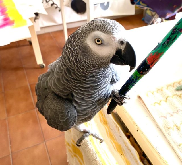 なぜかオウムが、筆を強く握りしめる。左利きなのか、つかむのは必ず「左足」で(写真)。オウムの握力はすさまじく(←木から落ちないように)かなり本気で引っ張っても