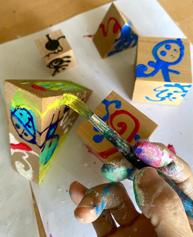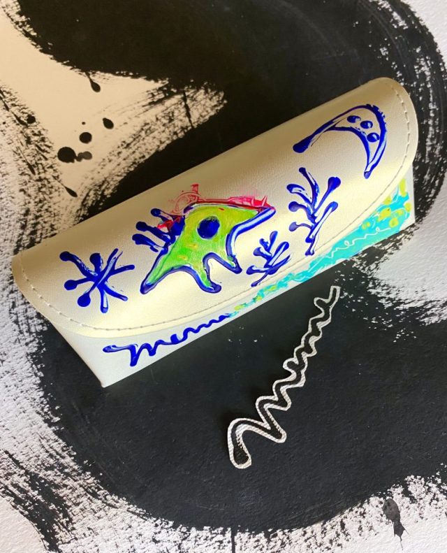 アトリエでペイントしていられることに感謝しながら、あるものなんでもアート。本日はメガネケース。素材箱の中から3つも出てきた。その横で、四角や三角の木片にもペイント。