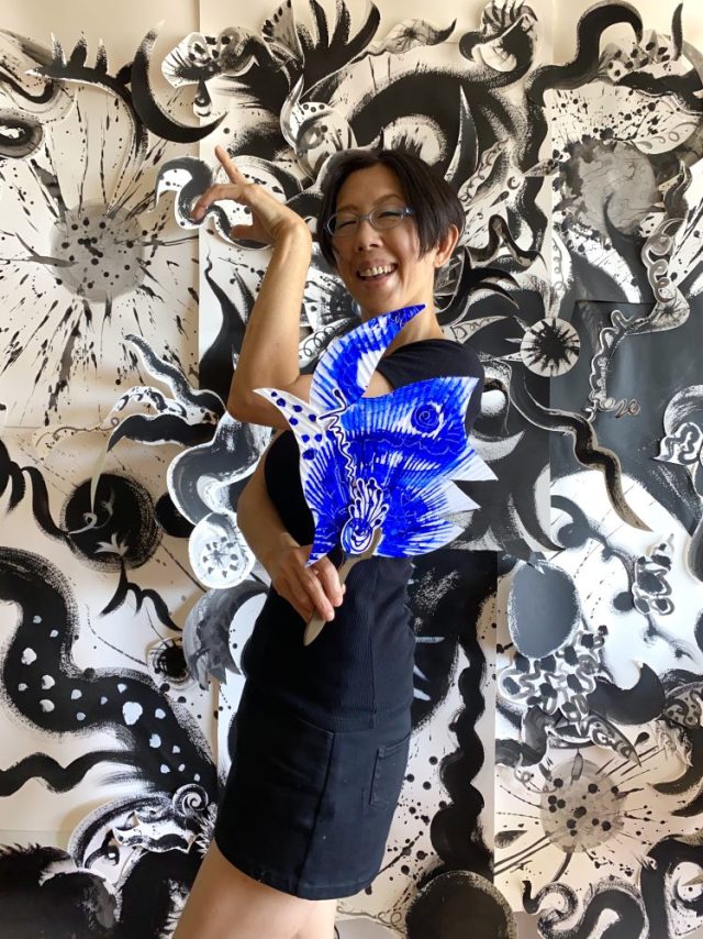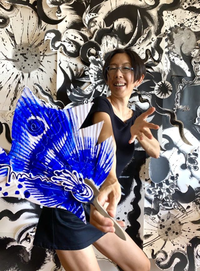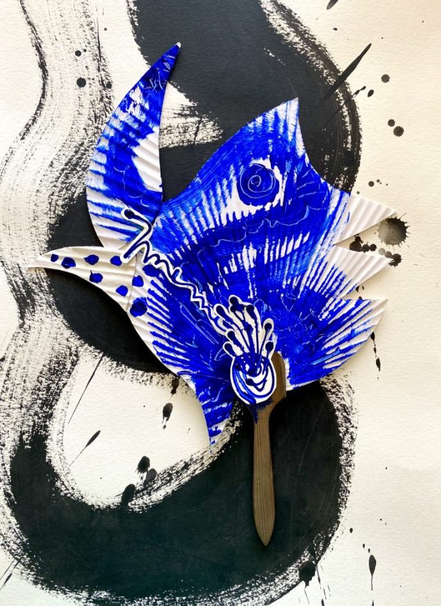 うちわアート。「己」の文字が踊る。30枚近くいただいたうちわに、ペイント&コラージュするうちに「カットしたらどうか⁉︎」とひらめいて。ハサミ片手にいきなり始まる〜(笑)。