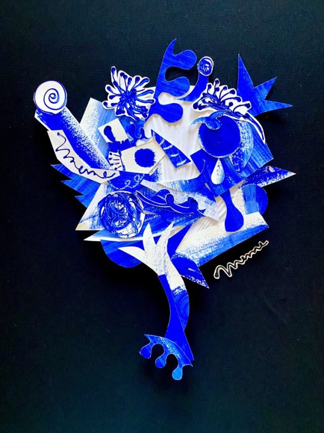 うちわアート。残り物の青い紙切れを使ってコラージュ。「空守り(青空の精)」が「空気を守ろう!」と、エールアート。