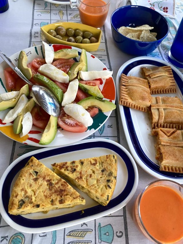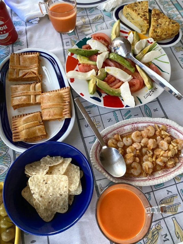 ガスパチョ、トルティージャ(スペイン風オムレツ)、パイ、エビのアヒージョ、アボカド・トマト・モッツァレラチーズのサラダ・・・