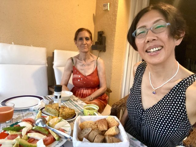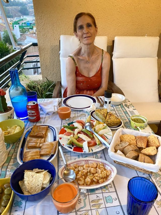 カルメンの表情が和らぐ。ヨーロッパは、8月はバケーションシーズン。人員不足で飛行機のキャンセルが相次ぐ中、息子さんがフランスからマラガへ。よかったね。それにしても、カルメンのテーブルの華やかなこと。