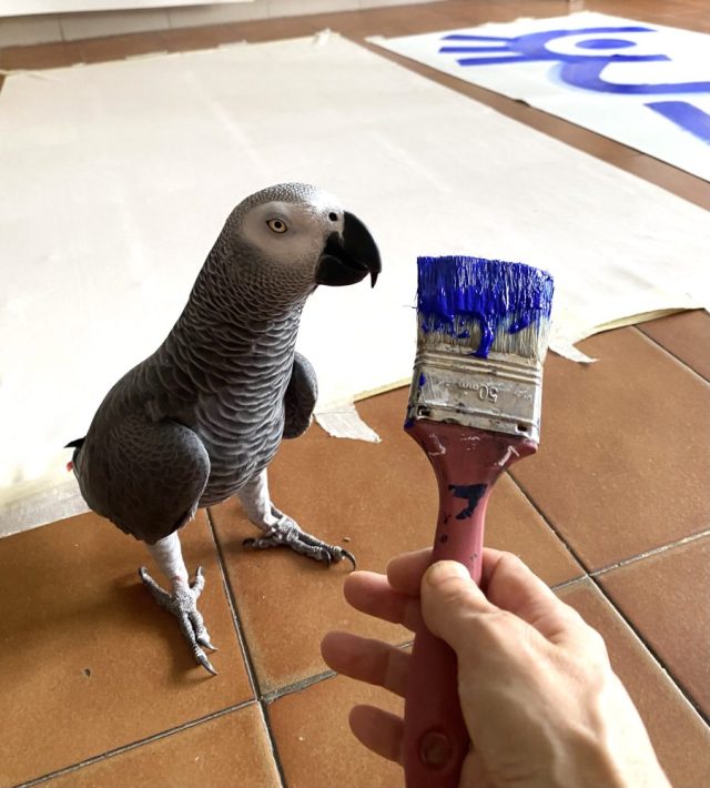 ほっとしたら、やる気がむくむくと。床に紙をどばっと広げて。オウムがすぐに飛んで来る。この写真を尼僧のテレサ叔母さんへ送ったら
