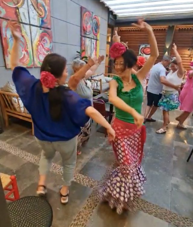 すくっとテーブルから立ち上がり、ダンススペースへと走る。砂苗さんと楽しくセビジャーナス。それを動画撮影してくれる千恵さん。友達っていいなぁ(動画はFacebookでご覧いただけます)。