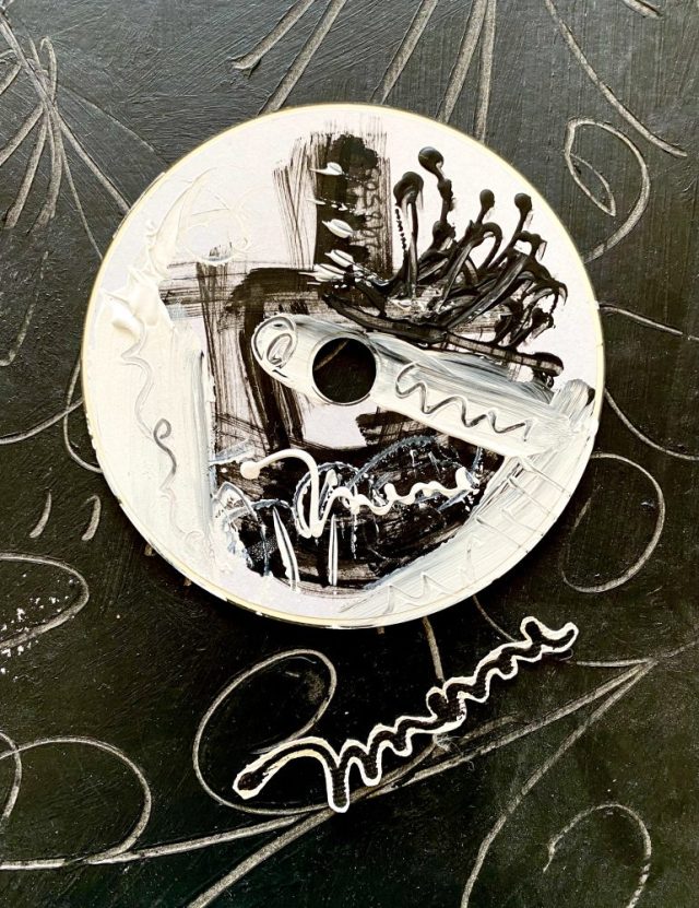 「自由」の文字が重なり、ひとつになる。その中心に、目を持つ。闇を見つめ、しかし闇に飲み込まれない魂。洗脳、支配から身をかわせ。自由な心は羽を持つ。CDアート。