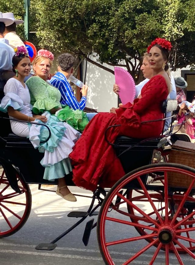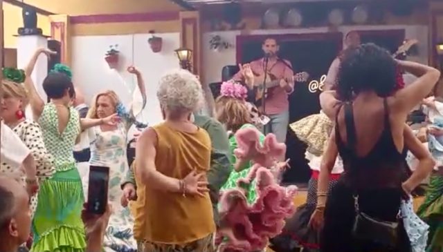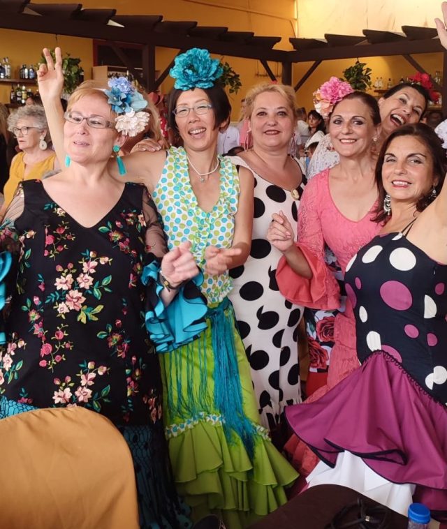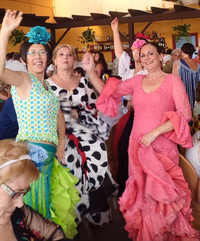 前方のダンススペースへ駆け出す私たち。スペインでは年齢、性別に関係なく、みなさん元気。気軽に踊る。どんな曲でも自然に体が動いちゃう〜。
