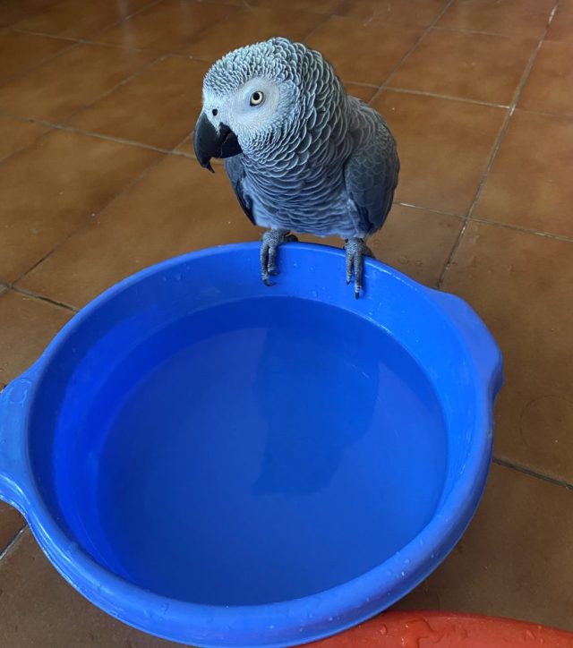 オウムも水浴びを要求。だよね〜。さっそくプールを設置。赤(大)と青(小)の2つ。好きなようにやってくれ〜。その横で、CDやバッグ、紙やキャンバスにペイント。