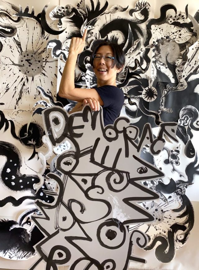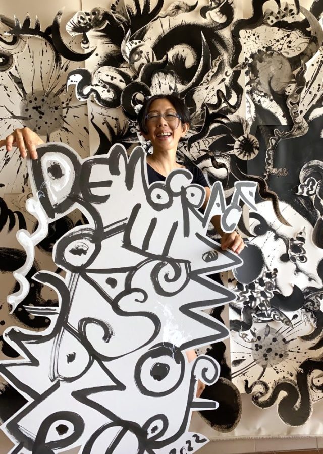 「DEMOCRACIA」が「LIBERTAD(自由)」「ESPERANZA(希望)」「AMOR(愛)」の文字で支えられている。エールアート。