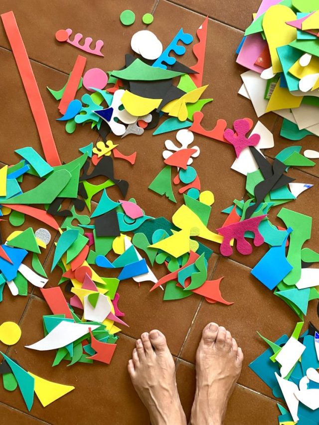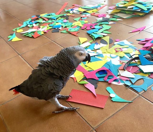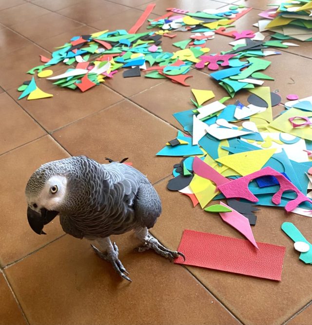 この布、実は日本の「帯」。あるもの何でも使って。その横で、余ったキレハシを大整理。オウムも参加。色とりどりが好きなんだよね。