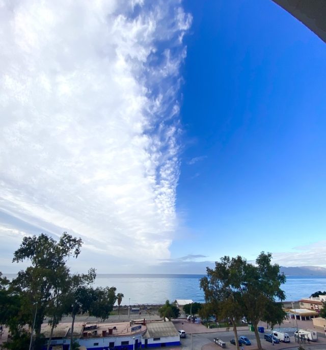マラガは「1年のうち270日が晴天」と言われるほど、太陽の町。青い空がシンボル。なのに、ケムトレイルがまかれ、白い散布雲が青空に頻繁に刻まれるようになった。