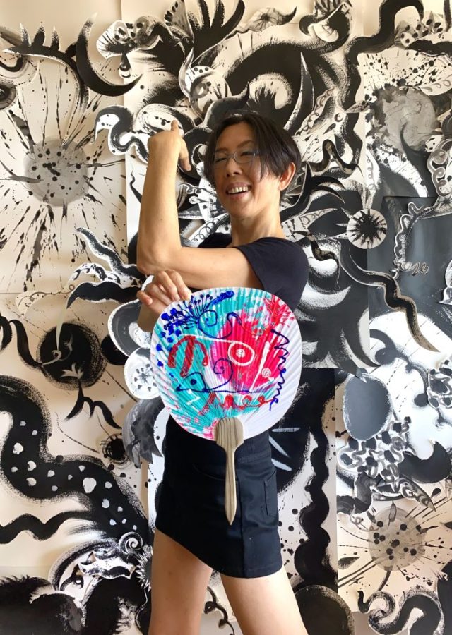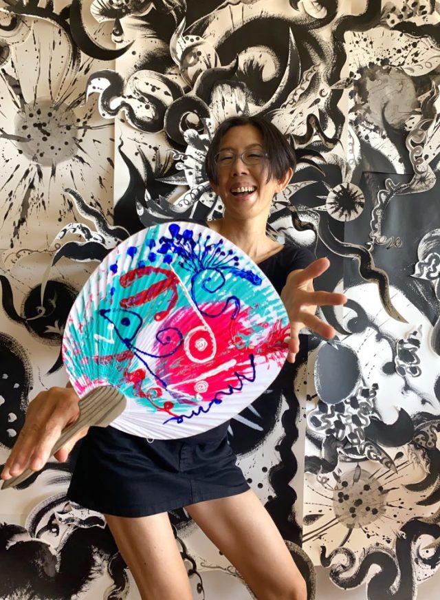 「ESPERANZA(希望)」の文字が、弾ける。太陽と月の上で。歓びと悲しみ、笑と涙、希望と絶望の上で。うちわアート。