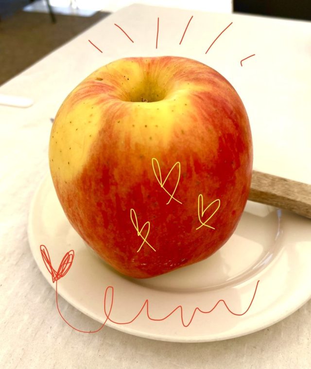 だった。聞けば、アイスクリームもプリンも売り切れとのこと。じゃ〜と頼んだリンゴがこちら(写真)。めちゃ大きい〜。ソフトボールかー。お兄さんがウインクしながら