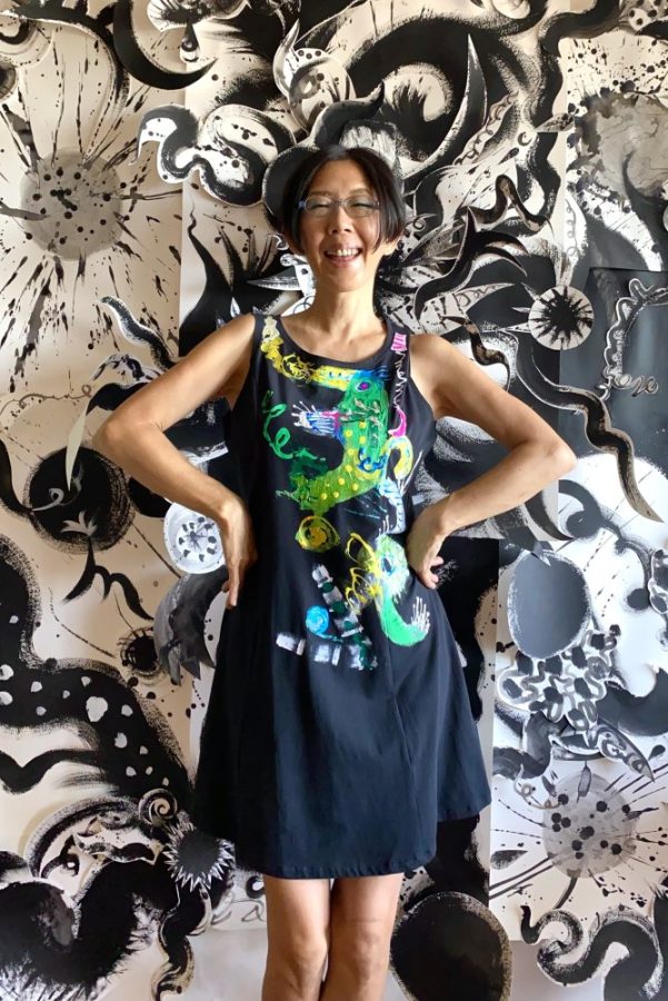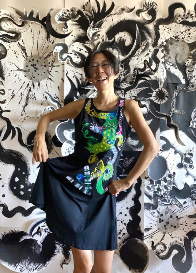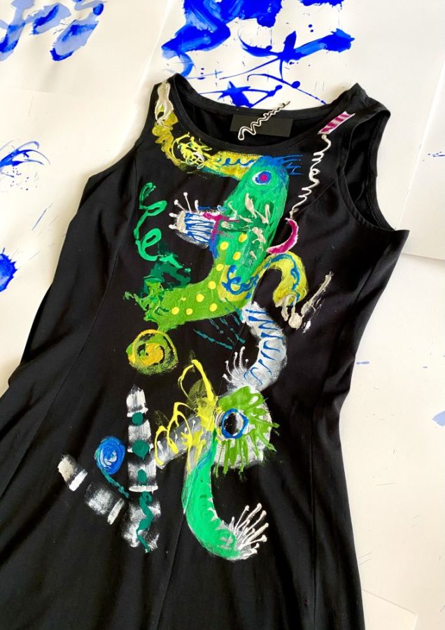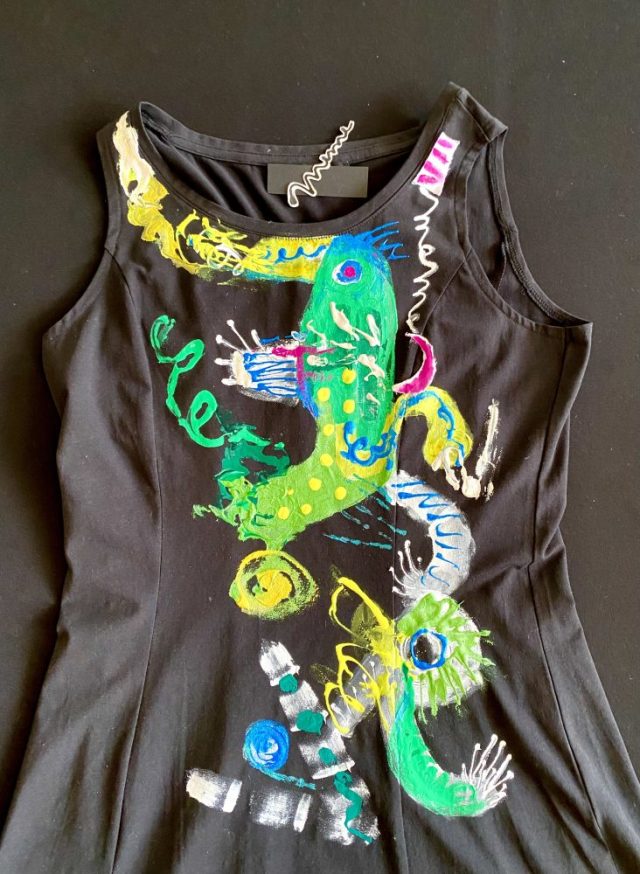 【一日一作プロジェクト】もも衣アート「いのちファースト」を作った。バーゲンで買った黒いワンピースにペイント。ペイントするために買うので