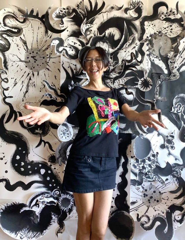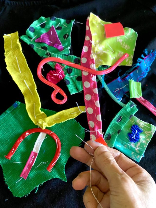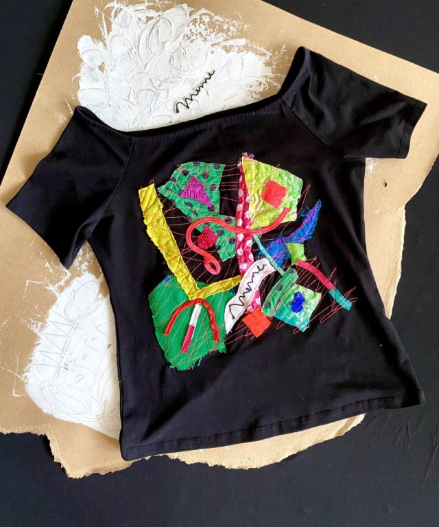 【一日一作プロジェクト】「自由花を咲かせよう」を作った。久しぶりに布のキレハシを使って、もも衣アート。まずは黒シャツに