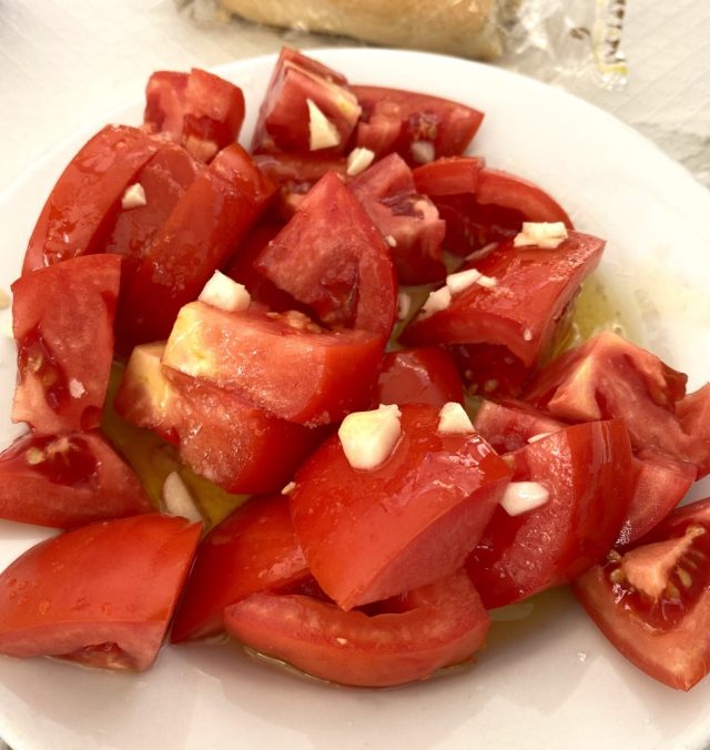みなさん、マラガにお越しの際はぜひトマトサラダをお試しください。ニンニクと塩、オリーブオイルだけなんだけど、めちゃうま〜。お皿に広がるオイルをパンで拭きとりながら