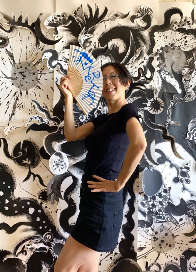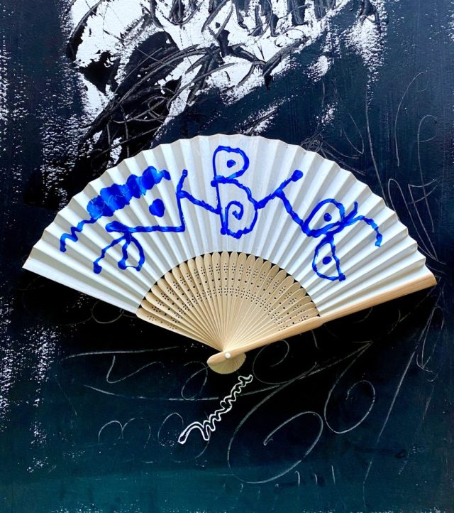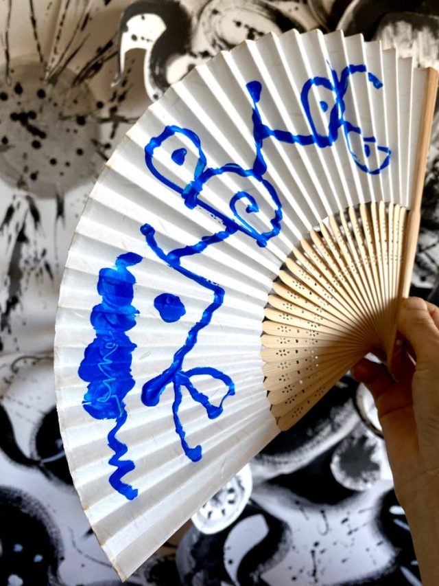 不思議な生き物たちが、心を結び手をつなぐ。よく見ると「LIBERTAD(自由)」の文字になっている〜。人間らしい、命を大切にする、選択の自由が守られる世界を祈って。扇子アート。