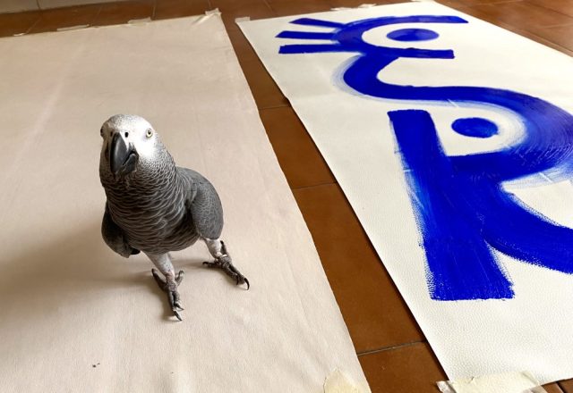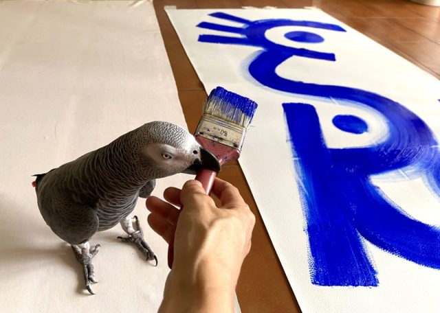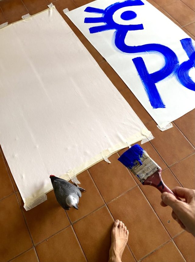 【一日一作プロジェクト】「結んでつないで」を作った。床でペイントしていたら、さっそくオウムがやって来た。とにかく