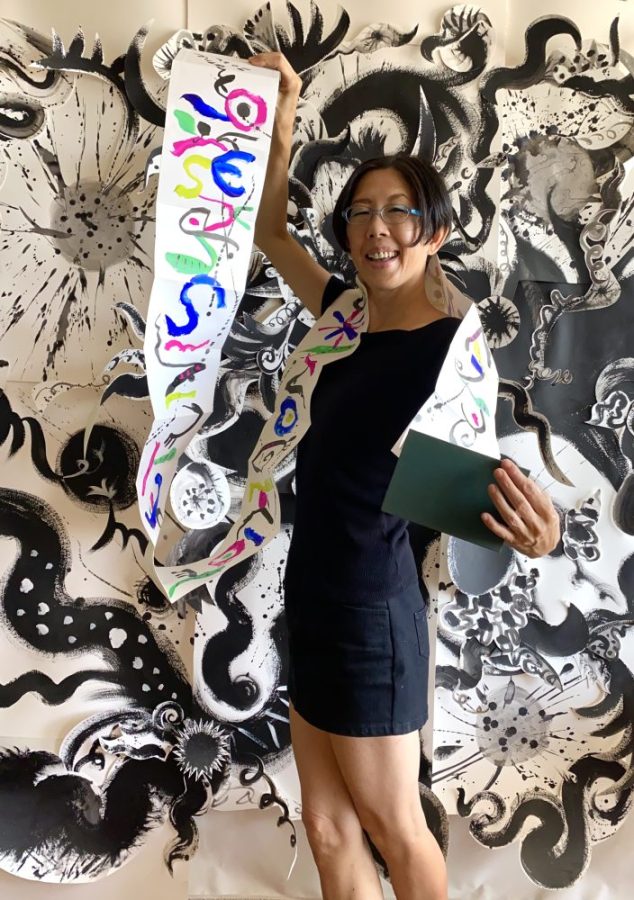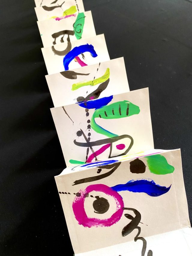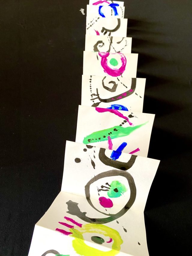 日本でもらったジャバラの帳面(折本)にペイント。「選択の自由」「命を大切にする世界を」という文字が踊り、飛びはね、ひとつに結ばれる(アルファベット&漢字)。ももアートは