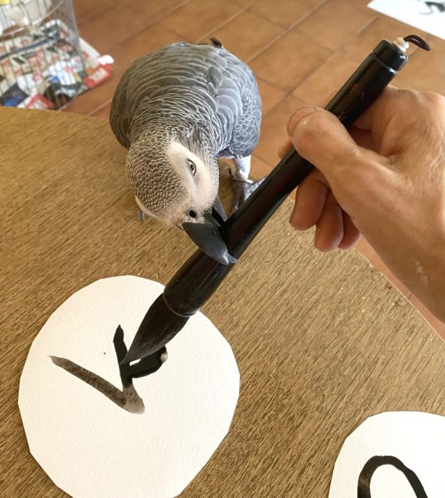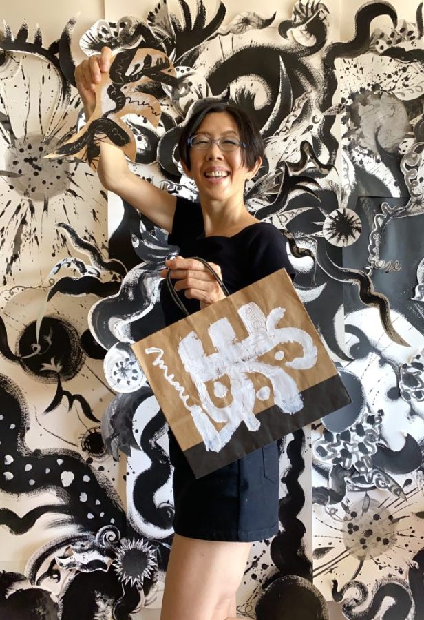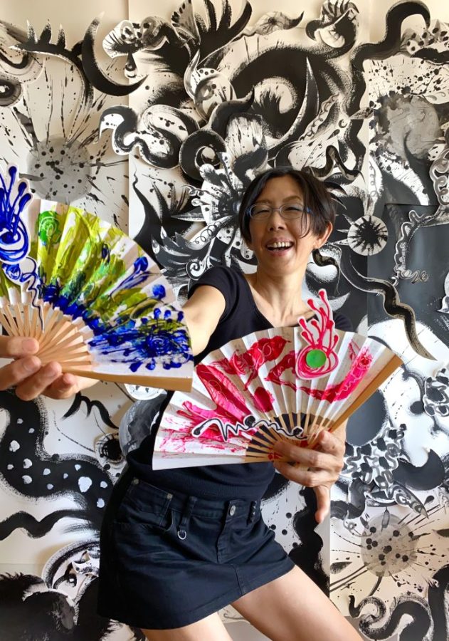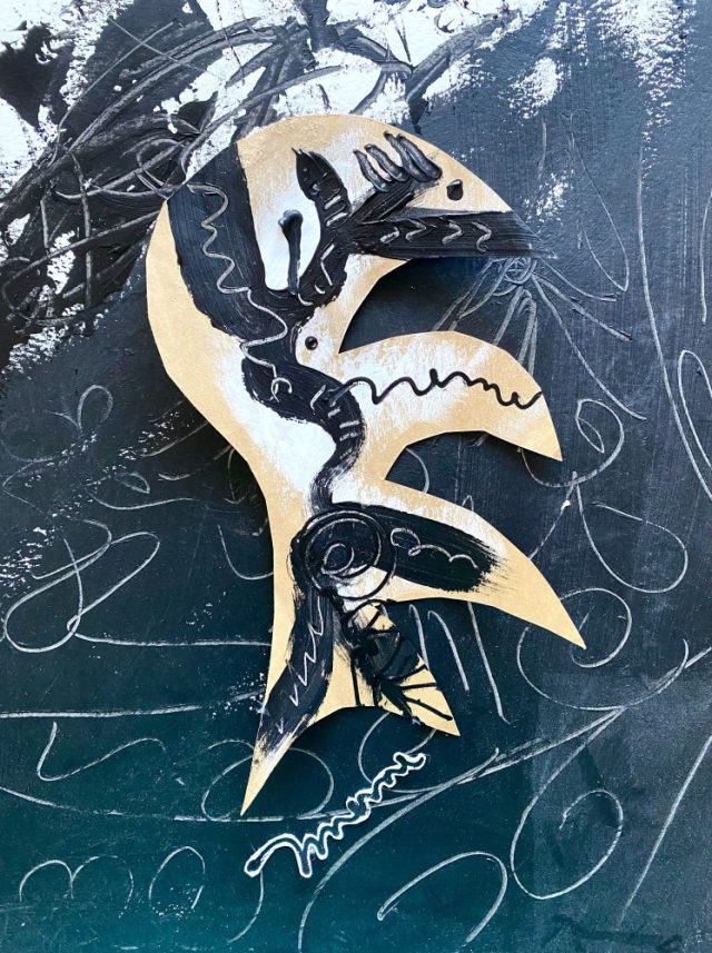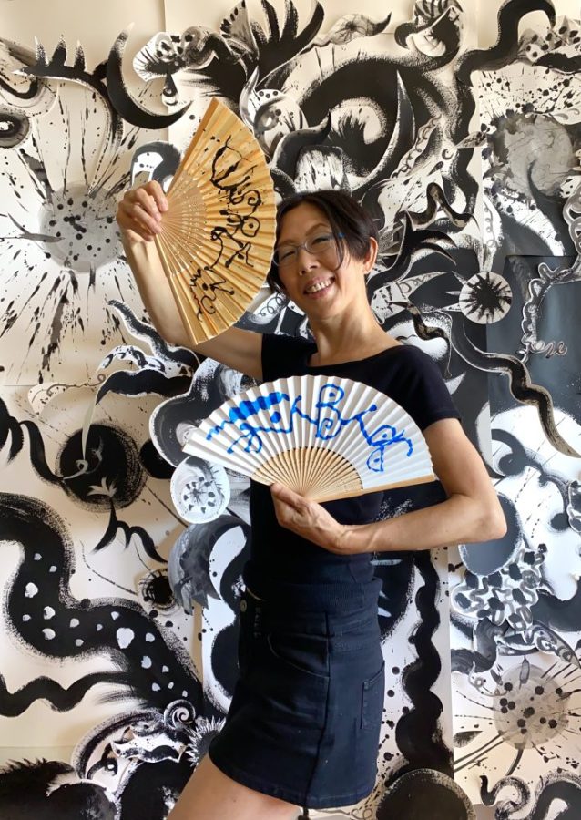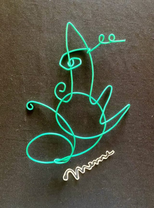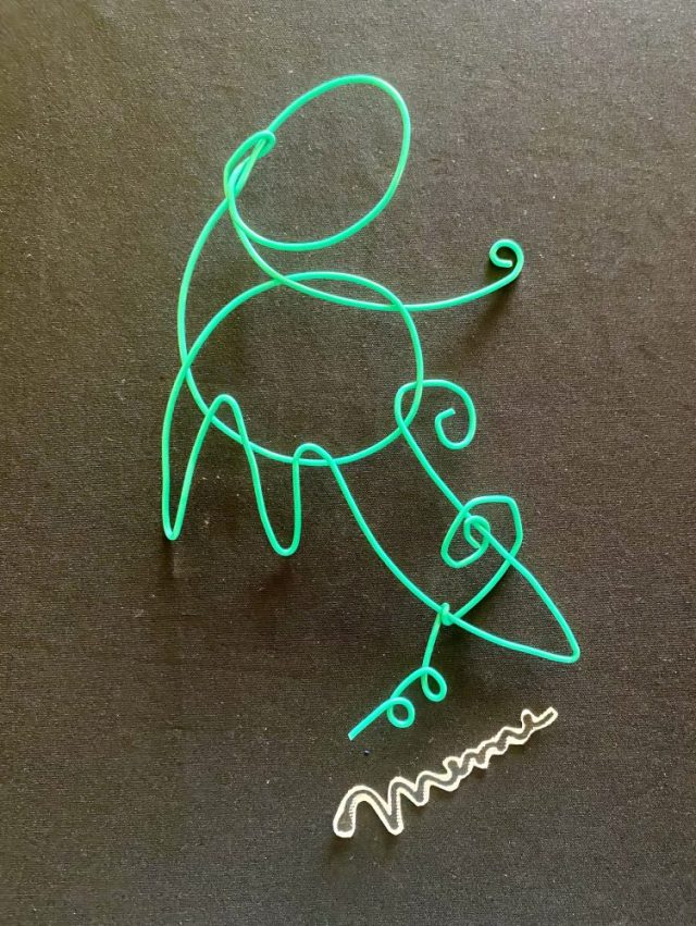 パーツアートとワイヤーアート。「ESPERANZA」「AMOR」の文字が踊る。その横で、日本の筆でペイント中。