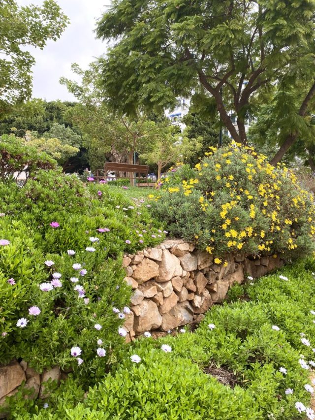 花は、無条件に私たちを幸せな気持ちにしてくれる。木陰を歩き、ベンチに座り、鳥の声に耳を澄ませ。公園の一角では、体操やカスタネット教室が行われている。